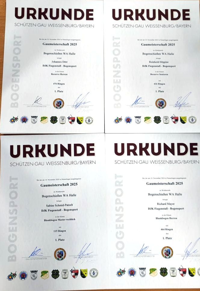 - Am 24.10.2025 führte der Schützengau Weißenburg unter Vorsitz des Gauschützenmeisters Klaus Kemmelmeier den Ehrungsabend für die erfolgreichen Schützen des Gau Weißenburgs durch, begleitet von den Ehrengästen Landrat Manuel Westphal, Bezirksschützenmeister Georg Schimmel, BLSV-Kreisvorsitzender Patrick Fischer und Bürgermeister Joachim Wegerer. Hier wurden den Siegern aus der abgelaufenen Saison die Urkunden überreicht, bei den Bogenschützen für die letzte Gau-Meisterschaft in der Halle. Für die DJK Fiegenstall waren dies: Herbert Schmid, Richard Mayer, Johannes Dörr und Reinhold Höppler.
