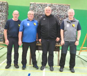 - Auf dem Bogenplatz in Fiegenstall führten die Bogenschützen der DJK Fiegenstall ihre Vereinsmeisterschaft für die Halle für das Sportjahr 2025 durch. Geschossen wurde hier auf die Hallenentfernung 18m. Die Ergebnisse: Recurvebogen Herren: Johannes Dörr (582 Ringe); Recurvebogen Senioren: Reinhold Höppler (449 R.); Blankbogen Herren: Richard Mayer (565 R.); Blankbogen Master M: Herbert Schmid (430 R.), Thomas Altmann (253 R.), Michael Adametz (225 R.); Blankbogen Master W: Elke Altmann (256 R.), Sabine Schmid-Patzelt (126 R.); Leider konnten aus terminlichen Gründen keine weiteren Schützen daran teilnehmen. Natürlich darf zu einer gelungenen Veranstaltung auch das gesellige Beisammensein bei einer deftigen Brotzeit zum Abschluss nicht fehlen.